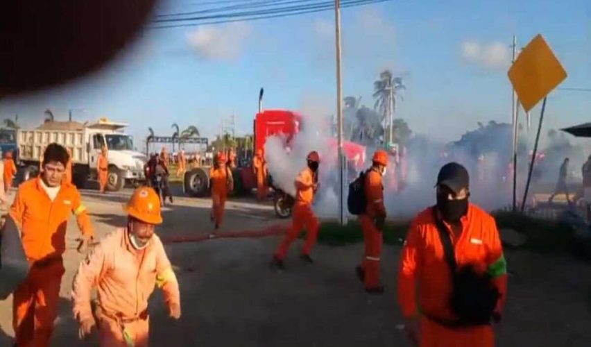 Dos Bocas, Tabasco, 13 de octubre de 2021.- Este miércoles por la mañana elementos antimotines de la policía tabasqueña y marinos se enfrentaron con trabajadores de ICA Fluor en la refinería de Dos Bocas. Este es el segundo día de protestas en el sitio, ya que denuncian incumplimiento de pagos y extorsiones.
