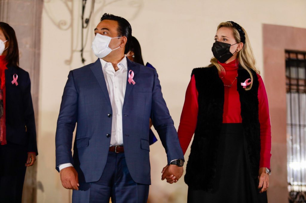 Querétaro, Qro., 18 de octubre de 2021.- El gobernador Mauricio Kuri y su esposa Car Herrera, presidenta del Patronato del Sistema Estatal DIF, presenciaron junto al alcalde de la capital Luis Nava y su esposa Arahí Domínguez la ceremonia de encendido del Palacio de Gobierno.