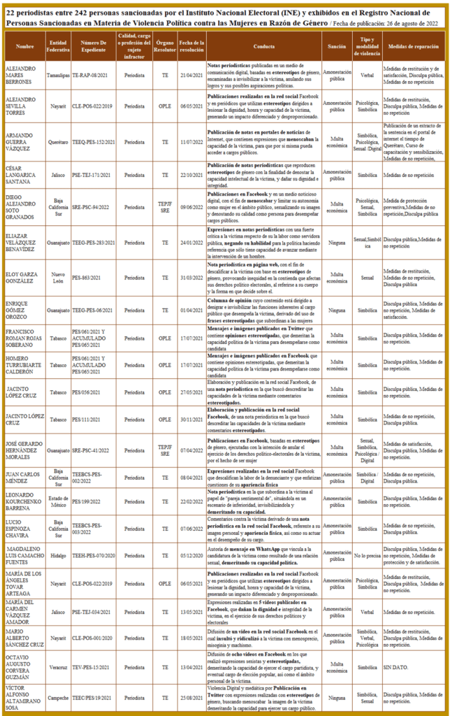 En ese registro de sancionados por petición del INE, desde 2019 hasta el 26 de agosto de 2022, aparecen 21 personas que identifican como periodistas de 16 entidades de la república: Alejandro Mares, Alejandro Sevilla, Armando Guerra, César Langarica, Diego Alejandro Soto, Eliazar Velázquez, Eloy Garza, Enrique Gómez, Francisco Román, Homero Turrubiarte, Jacinto López (dos veces), José Gerardo Hernández, Juan Carlos Méndez, Leonardo Kourchenko, Lucio Espinoza, Magdaleno Luis Camacho, María de los Ángeles Tovar, María del Carmen Vázquez, Mario Alberto Sánchez, Octavio Augusto Corvera y Víctor Alfonso Altamirano. Allí no aparece todavía Erick Gutiérrez (ver lista adjunta).