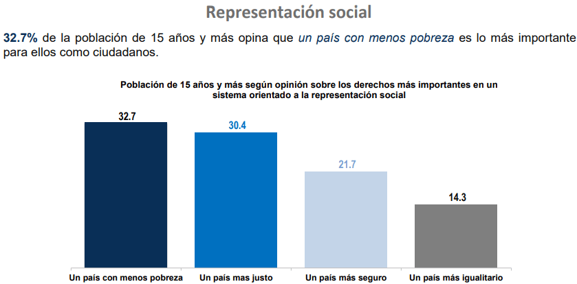 Otras respuestas que resaltan son a la pregunta de ¿Qué derechos (consideran) son los más importantes en un sistema de representación social? (ver https://www.inegi.org.mx/contenidos/programas/encuci/2020/doc/ENCUCI_2020_Presentacion_Ejecutiva.pdf).