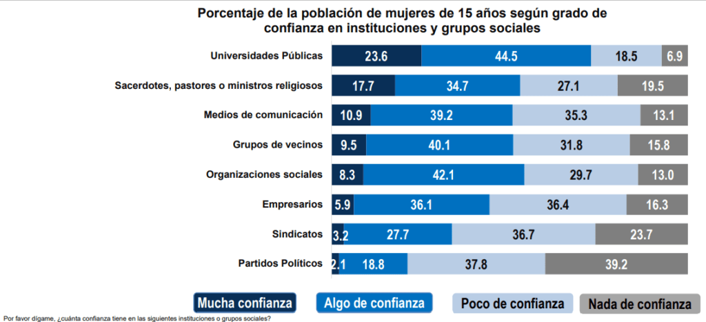 En la encuesta del Inegi los partidos fueron puestos en el último lugar de confianza por la población mayor de 15 años. Casi 40 por ciento de los encuestados desconfían totalmente y apenas un 2.1 por ciento confía en ellos (ver gráfica).