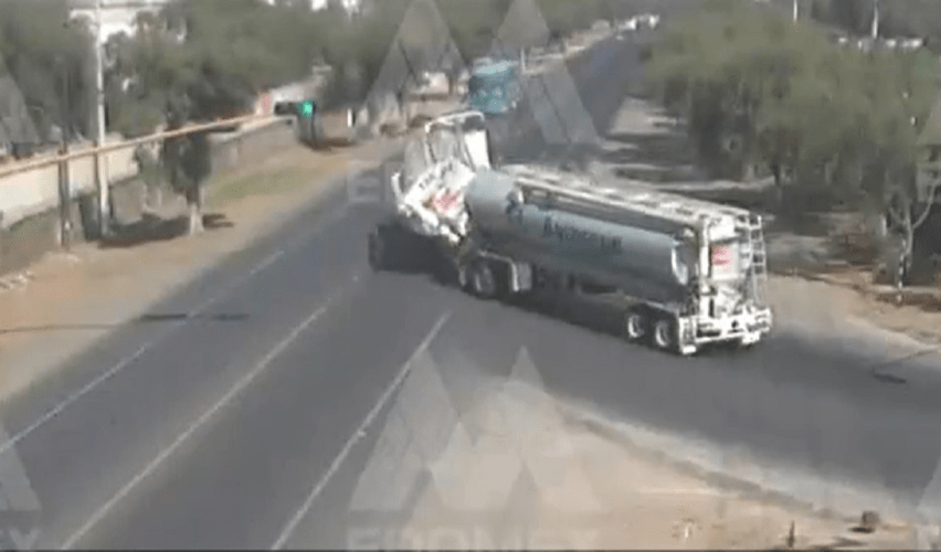 Ciudad de México, 21 de enero de 2023.- En Tecámac, Estado de México, un tráiler de doble remolque se volcó en la carretera libre México-Pachuca, a la altura del kilómetro 46, las imágenes fueron compartidas por el C5 del Edomex y se apreció el momento en que el vehículo perdió el control e impactó contra el asfalto.