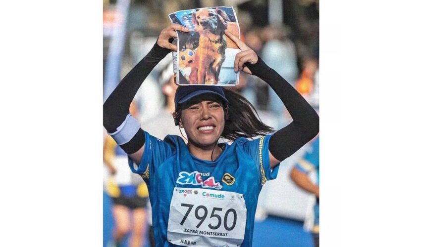 Guadalajara, Jal., 1 de marzo de 2023.- Durante el Medio Maratón de Guadalajara, realizado el domingo 26 de febrero, la atleta Zayra Montserrat Zeferino cruzó la línea de meta con la foto de su perrita Lya, la cual falleció unos días antes de la competencia.