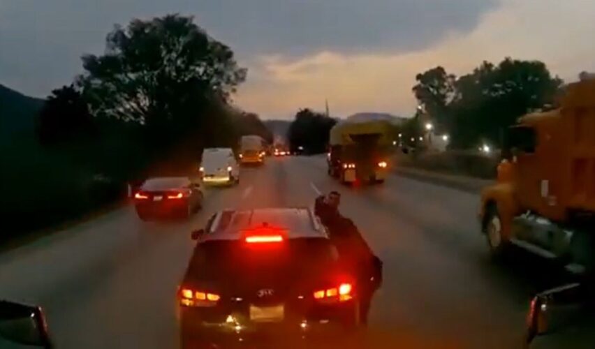 De acuerdo con el video compartido en redes sociales, una camioneta color negra se atraviesa y se pone enfrente del camión de carga para que éste baje la velocidad.