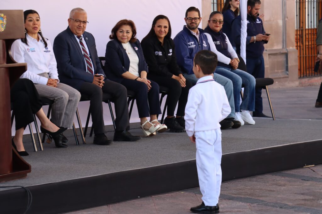 La presidenta del Patronato del Sistema Municipal DIF, Adriana Olvera de Macías, felicitó a todas y todos los niños por el ejemplo cívico al mostrar respeto a nuestro Lábaro Patrio, así como a los padres de familia y maestras que acompañaron en este ejercicio a sus hijos.