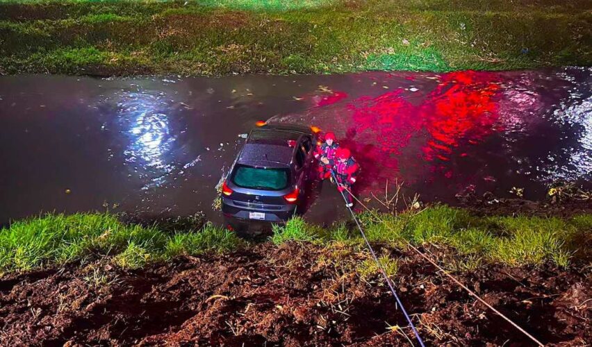 El incidente ocurrió cuando un Seat Ibiza, con dos mujeres y un hombre, cayó al canal; las tres personas fueron rescatadas por personal de emergencias, posteriormente valoradas por el Centro Regulador de Urgencias Médicas (CRUM) y reportadas en condición estable, mientras que el vehículo fue retirado del lugar con apoyo de una grúa.