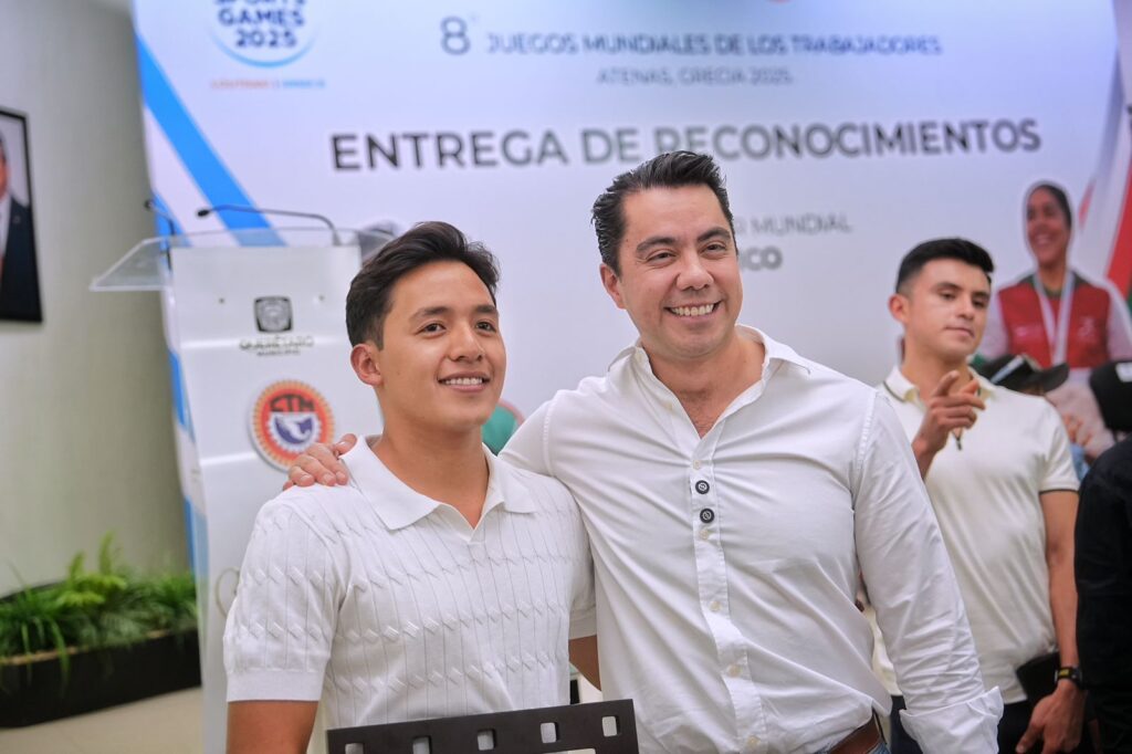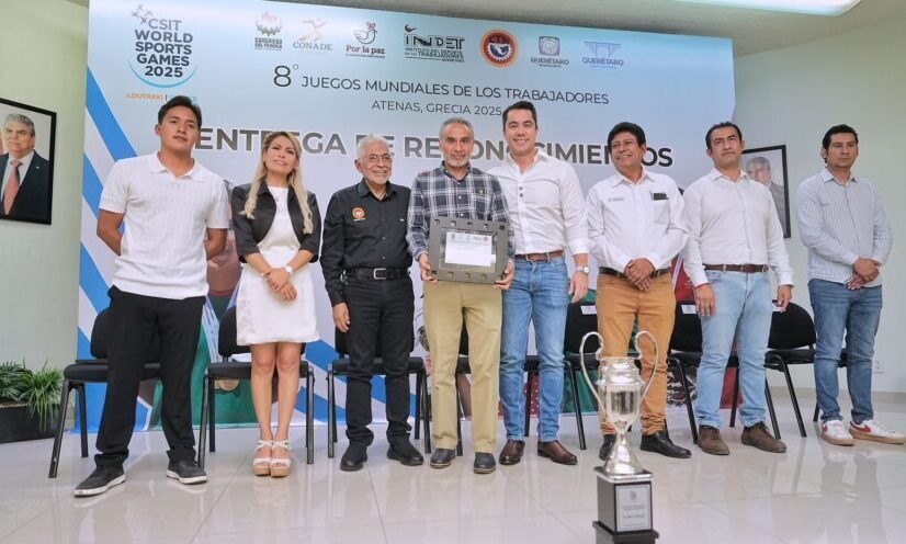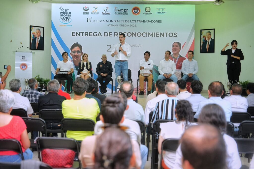 Querétaro, Qro., 28 de junio de 2025.- El presidente municipal de Querétaro, Felifer Macías, entregó reconocimientos a las y los 25 atletas queretanos afiliados a la CTM que representaron a México en la octava edición de los Juegos Mundiales de los Trabajadores, celebrada en Atenas, Grecia, donde lograron un destacado segundo lugar a nivel internacional al obtener un total de 76 medallas en disciplinas como ajedrez, atletismo, natación y voleibol de playa femenil.