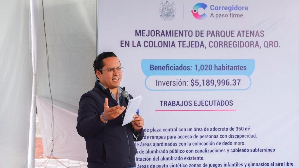 Corregidora, Qro., 29 de junio de 2025.- El presidente municipal de Corregidora, Chepe Guerrero, entregó las obras de mejoramiento del parque Atenas, ubicado en la colonia Tejeda, en beneficio de más de mil habitantes, con una inversión superior a 5 millones de pesos.