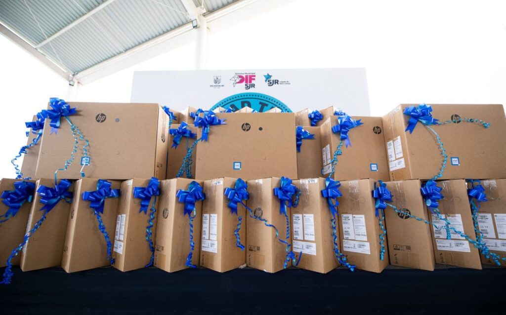 San Juan del Río, Qro., 11 de septiembre de 2025.- Con la finalidad de fortalecer la educación y el aprendizaje de las y los estudiantes de la telesecundaria Francisco Villa, ubicada en la comunidad El Sitio, la presidenta del Sistema Municipal para el Desarrollo Integral de la Familia (DIF) de San Juan del Río, Gina Sánchez Barrios, y el alcalde sanjuanense, Roberto Cabrera Valencia, entregaron 30 equipos de cómputo de escritorio a la comunidad escolar, como parte del Programa “Mitad Tú, Mitad Yo”.