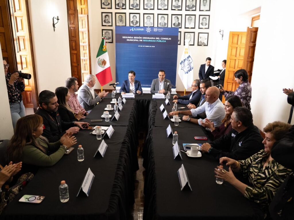 El Marqués, Qro., 7 de octubre de 2025.- El presidente municipal de El Marqués, Rodrigo Monsalvo Castelán, encabezó la segunda sesión ordinaria del Consejo Municipal de Seguridad Pública, en la cual se presentó un informe sobre el avance en la estrategia de seguridad. Durante la sesión también se dieron a conocer programas orientados a fortalecer las capacidades operativas y preventivas de la Secretaría de Seguridad Pública Municipal (SSPM).
