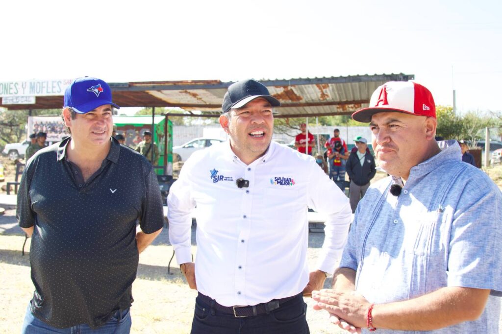 San Juan del Río, Qro., 27 de octubre de 2025.- El presidente municipal de San Juan del Río, Roberto Cabrera Valencia, encabezó la ceremonia de inauguración de las gradas en el campo de beisbol de la comunidad Ojo de Agua, donde también quedó formalmente iniciada la Liga de Beisbol 2025-2026, a quienes convocó a consolidarse como un ejemplo en la región.