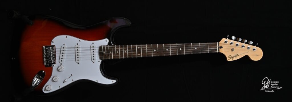 Primero te muestro la Stratocaster en acabado sunburst, de Squier, la línea sencilla de Fender. Aquí cabe aclarar que hay variantes de estas guitarras que pueden costar el doble, cinco veces y llegar hasta valores increíbles, como pudiera ser un instrumento hecho especialmente para una estrella como Eric Clapton o Mark Knopfler.