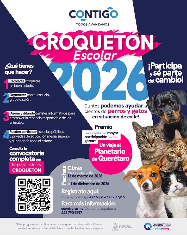 Querétaro, Qro., 13 de marzo de 2026.- Con la finalidad de fomentar la responsabilidad social y el respeto a los animales, se anunció la segunda edición del Croquetón Escolar, campaña dirigida a escuelas públicas y privadas de bachillerato y universidades.