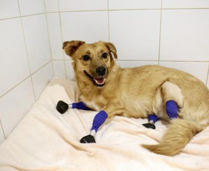 Perrita rescatada vuelve a caminar gracias a prótesis en sus cuatro patas