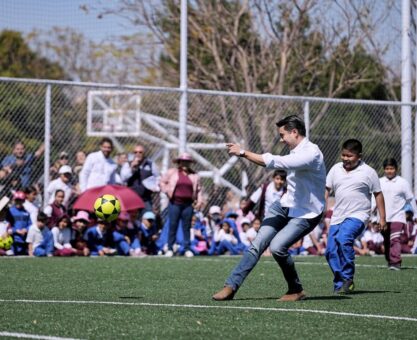 Entrega Felifer Macías cancha de futbol en primaria Héroes de Chapultepec
