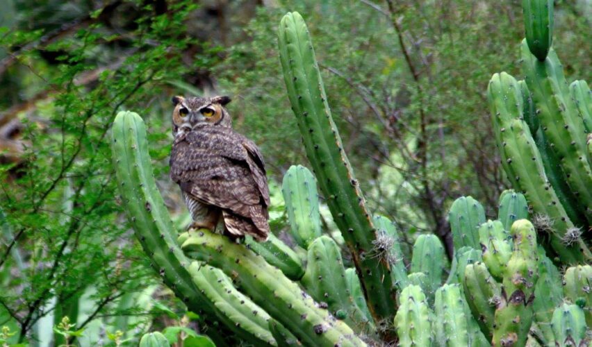 De hecho, he visitado Meztitlán unas cinco ocasiones y solamente en dos de ellas he tenido la oportunidad de ver al magnífico búho. Entonces, cuando empezamos a escuchar el “huu-huu” se me aceleró el corazón, puesto que ese llamado es característico del ave y con ello sabíamos también que estaba activo en plena luz de día, a pesar de sus hábitos nocturnos. Pero la excitación se enfrío un poco al desparramar la vista en el enorme espacio abierto de la pared de la barranca, con miles y miles de árboles, salientes de roca y cactáceas donde el búho podría pasar desapercibido, gracias a su espléndido camuflaje.
