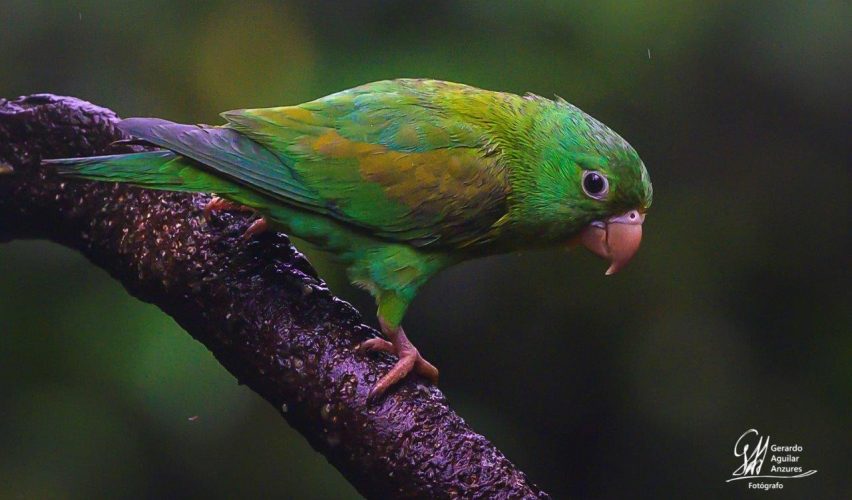 El periquito alas amarillas (Brotogeris jugularis) es una especie muy bella de psitácido, que apenas se encuentra en territorio mexicano, en la costa chiapaneca. En las zonas tropicales de Costa Rica es mucho más frecuente. Tuvimos la suerte de ver una pequeña bandada de unos 8 individuos que iban y venían de los árboles frente a nosotros. En Costa Rica, es más común conocerlo por el nombre en ingles “Orange-chinned parakeet” y efectivamente, tiene un pequeño parche de plumas color naranja bajo el pico. El nombre me parece tan poco contundente como “alas amarillas”, pero en fin, hay que llamarle de alguna manera.