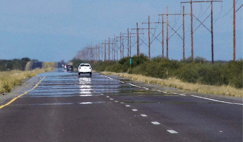Viajas en tu auto por una carretera recta, solitaria, en un día caluroso, seco y soleado. El paisaje es precioso, arbustos, barrancas y desierto a tu alrededor, pero espera… hay algo insólito frente a ti. ¿Es eso un charco de agua en la carretera? ¿Cómo puede ser?