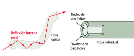 La capacidad de la fibra de confinar la luz que transita por ella, se basa en su estructura, en la cual la región central, el núcleo de la fibra, es rodeada por otro material, su revestimiento, de tal manera que por una selección apropiada de sus características ópticas, mantiene a la luz introducida en el núcleo de la fibra reflejándose continuamente en la interfaz entre ambos medios, sin posibilidad de salir. Esta propiedad se mantiene con una relativa independencia de la forma que adopte la fibra, afectándose sólo cuando ésta es flexionada con un radio de curvatura menor a un valor característico del diseño de la estructura.
