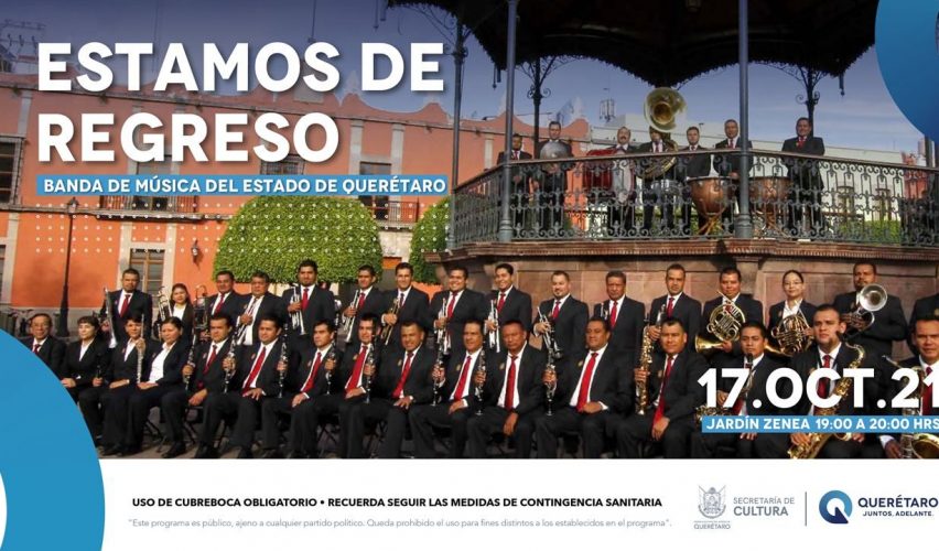 Querétaro, Qro., 16 de octubre de 2021.- Tras 19 meses de inactividad, este domingo 17 de octubre, de 19:00 a 20:00 horas, regresa al kiosko del Jardín Zenea la Banda de Música del Estado de Querétaro, para que los queretanos disfruten de una tarde llena de música con repertorios de ritmos variados como mambo, danzón, boleros, vals y chachachá; informó Marcela Herbert Pesquera, titular de la Secretaría de Cultura.
