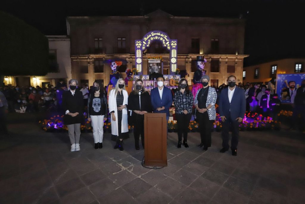 Querétaro, Qro., 29 de octubre de 2021.- El alcalde Luis Nava, en compañía de su esposa y presidenta del DIF municipal, Arahí Domínguez, encabezó el inicio del Festival Día de Muertos 2021 del municipio de Querétaro, con el encendido del altar monumental en el Jardín Guerrero, dedicado este año al cronista de la capital Andrés Garrido del Toral.