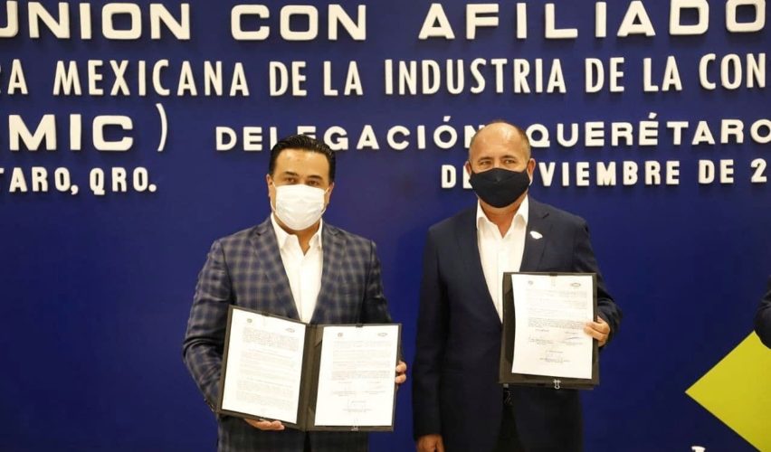 Querétaro, Qro., 21 de noviembre de 2021.- El alcalde de Querétaro, Luis Nava, se reunió con afiliados de la Cámara Mexicana de la Industria de la Construcción en Querétaro (CMIC) para firmar un convenio de colaboración. Con dicho acuerdo se retendrá un porcentaje del costo de la obra contratada a constructores afiliados con el fin de apoyar programas del DIF municipal dirigidos a grupos vulnerables o hacer capacitaciones.