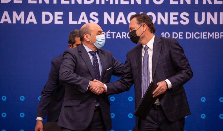 Querétaro, Qro., 10 de diciembre de 2021.- El gobernador Mauricio Kuri firmó un memorándum de entendimiento sobre el Programa de las Naciones Unidas para el Desarrollo (PNUD), que tiende puentes de comunicación para alcanzar los Objetivos del Desarrollo Sostenible de la ONU.