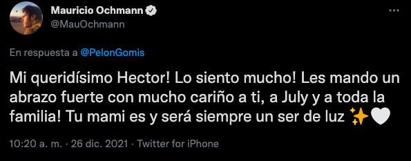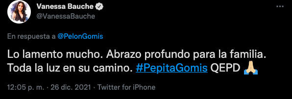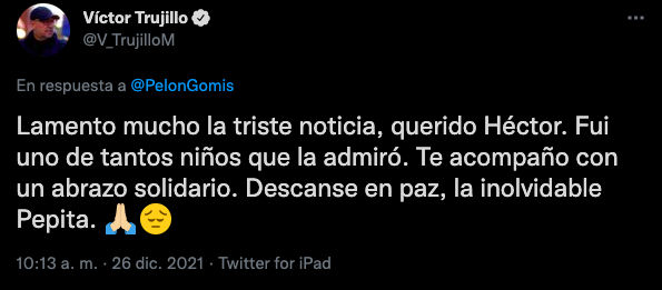 Por redes sociales, Héctor Suárez Gomís dio a conocer a los medios de comunicación la muerte de su progenitora: “Con profundo dolor, quiero compartir con ustedes el fallecimiento de mi mamá, Pepita Gomís”, escribió en Twitter. Diversas personalidades del medio del espectáculo han enviado sus condolencias a la familia este día.