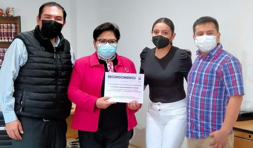 Querétaro, Qro., 3 de enero de 2022.- La labor antidiscriminatoria y enfocada a la defensa de la dignidad humana de la doctora Roxana Ávalos Vázquez, presidenta de la Defensoría de los Derechos Humanos del Estado de Querétaro (DDHQRO), fue reconocida por Manuel Edmundo Ramos Gutiérrez, presidente de SOS Discriminación Internacional Querétaro, así como por Esthefania Álvarez Ramírez y Juan Carlos Martínez Téllez, integrantes del Observatorio Juvenil por la No Discriminación Querétaro (OJQ).