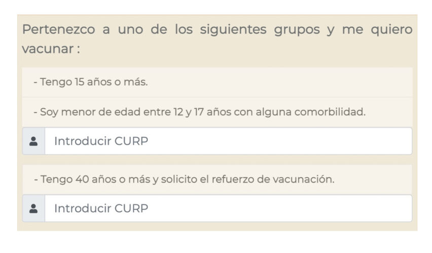 También pueden registrarse para la aplicación de la vacuna quienes tengan 15 años o más y jóvenes entre 12 y 17 años con alguna comorbilidad. Para realizar el procedimiento, se requiere ingresar la CURP en el sitio; se solicitan datos personales y la fecha de la última dosis aplicada.