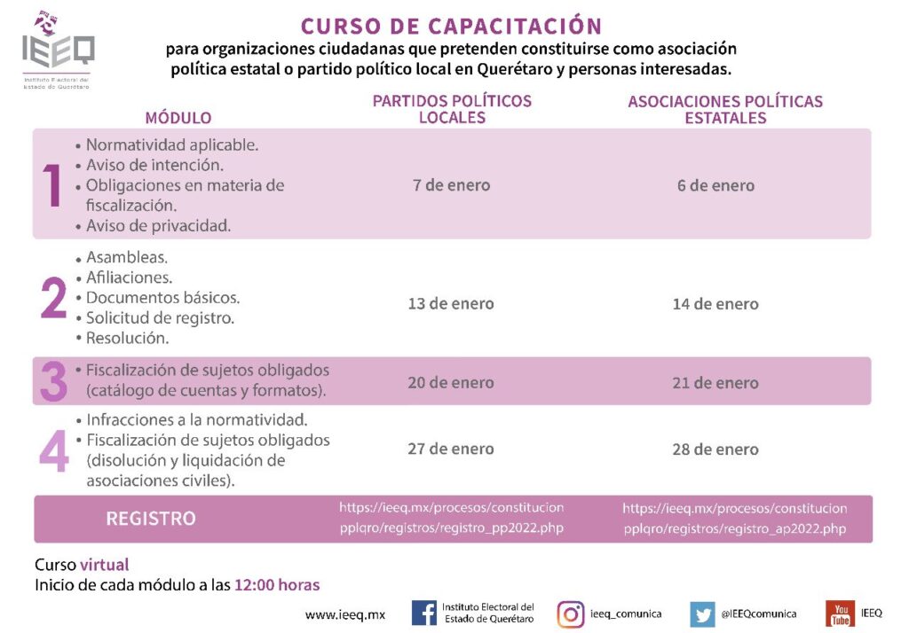 La capacitación sobre partidos políticos locales se realizará los días 7, 13, 20 y 27 de enero; por otra parte, el contenido sobre la conformación de asociaciones políticas se impartirá los días 6, 14, 21 y 28 del mismo mes.