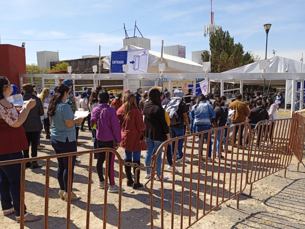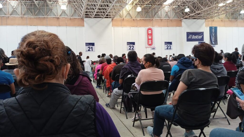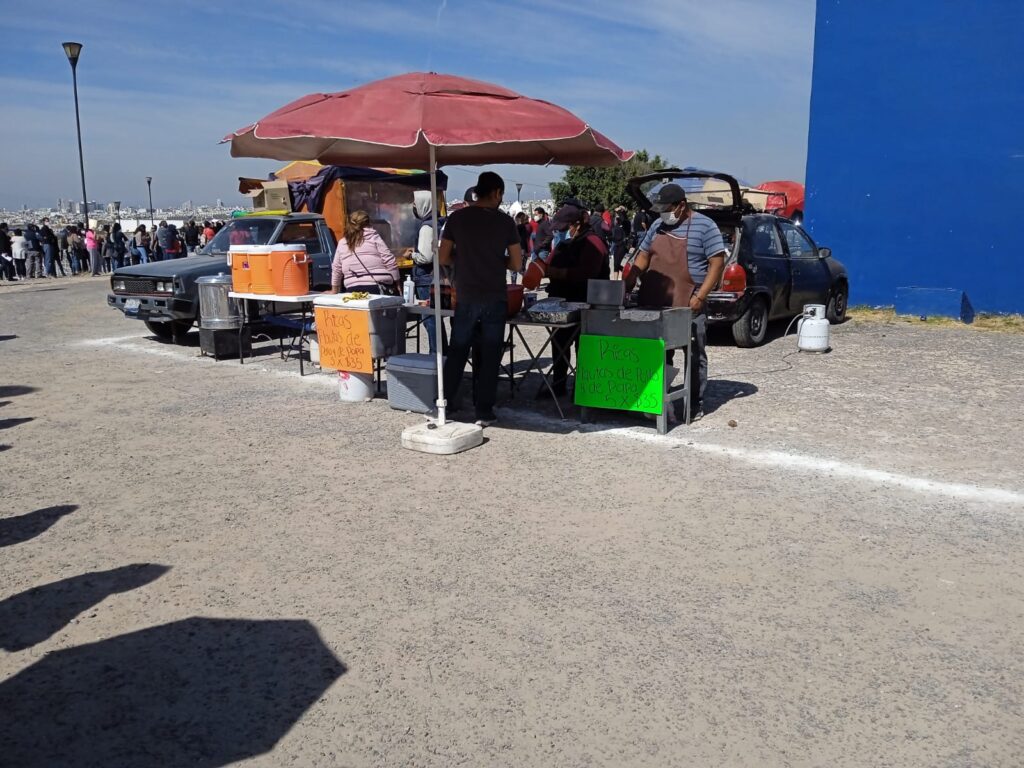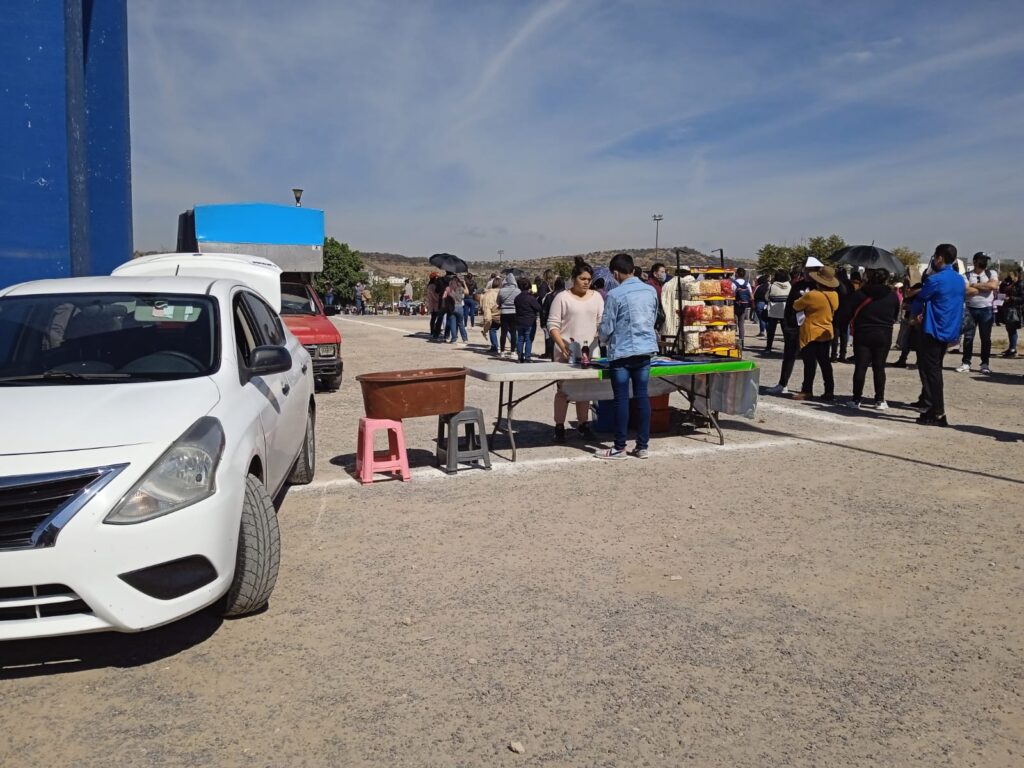 Se acerca a ella, le habla por su nombre y la abraza. Charlan por uno o dos minutos y la mujer que se acercó se retira a su lugar, donde su acompañante se coloca el folder con los formatos de vacunación en el rostro, para protegerse del sol. Cerca de ahí, un comerciante de flautas de pollo y de papa se dispone a recoger su puesto; antes del mediodía ya terminó su venta. Se sienta en una silla y se baja el cubrebocas a la papada, quizá de manera inconsciente, sin reparar para qué está toda esa gente ahí.