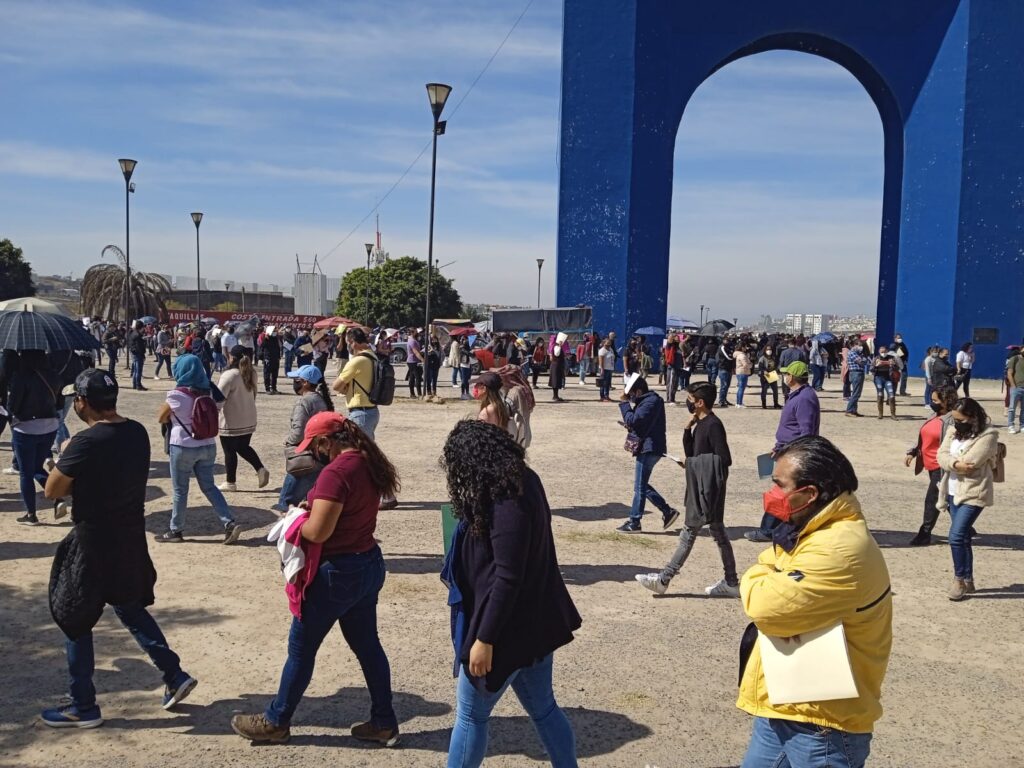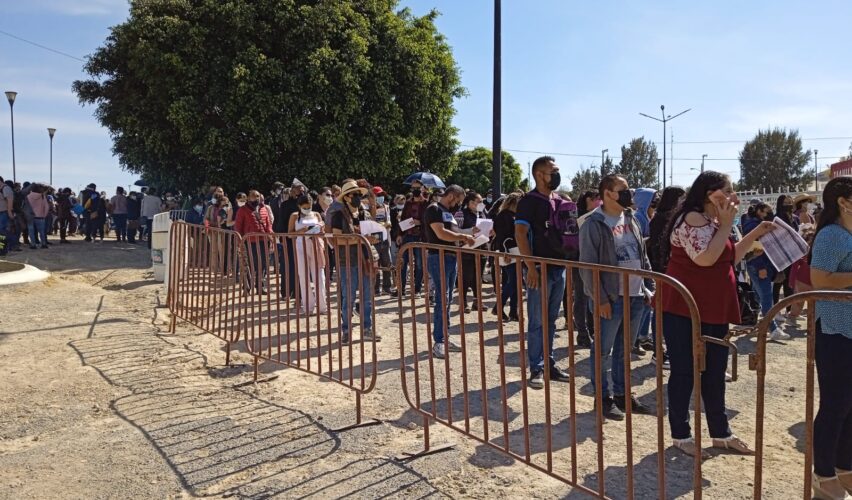 Querétaro, Qro., 12 de enero de 2022.- Maestros y personal del sector educativo de Querétaro acuden a la cita el Ecocentro. Los inmunizados con la vacuna CanSino van por su dosis de refuerzo, aunque tengan que esperar más de dos horas para la aplicación. A quienes llegan puntuales a la hora que los citaron, les espera una sorpresa: el ingreso al estacionamiento, en caso de ir en vehículo particular, es lento. El estacionamiento está lleno. Desde temprana hora permanece de esa manera. Son más los automóviles que ingresan que los que salen.
