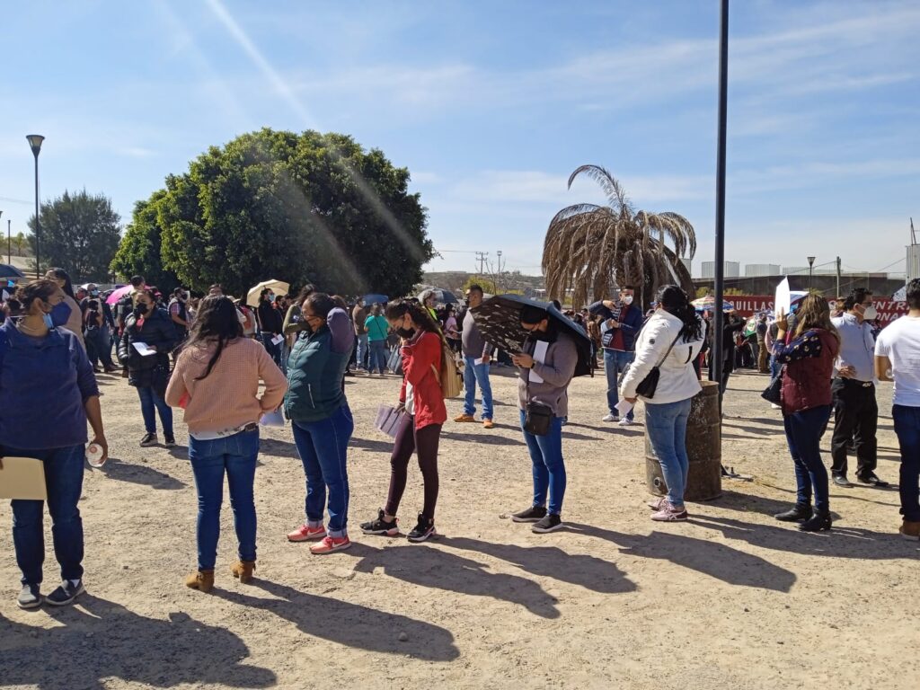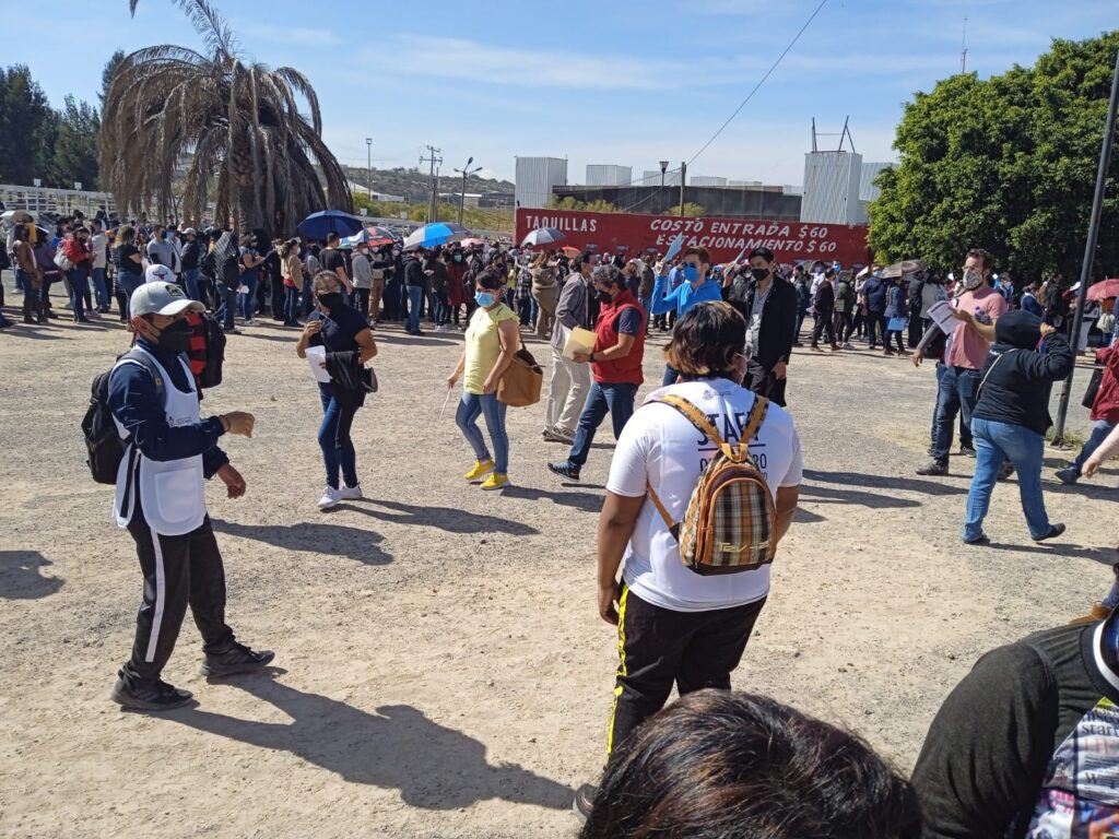 Luego de unos minutos de buscar lugar, llegan hasta donde se forman las filas para ingresar a la zona de espera y a la de vacunación. Las sombrillas y las gorras, luego de un rato, ocupan el lugar que antes era de bufandas y chamarras, sacadas del ropero por las bajas temperaturas matinales. Sólo 20 minutos bajo el sol queretano son suficientes para que los maestros, la mayoría de quienes serán vacunados, comiencen a sudar.