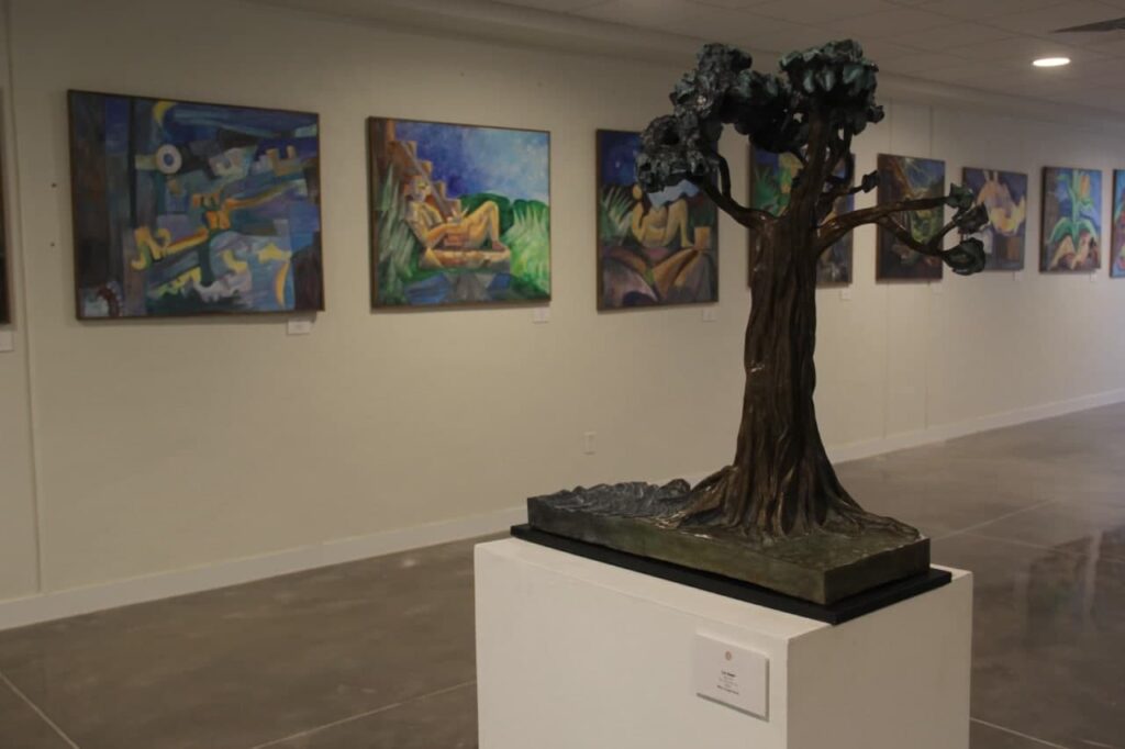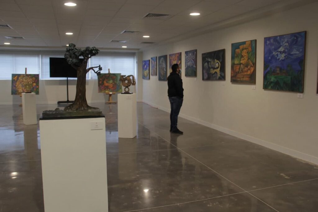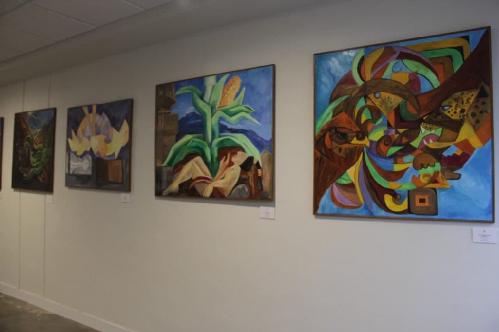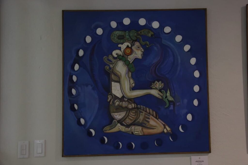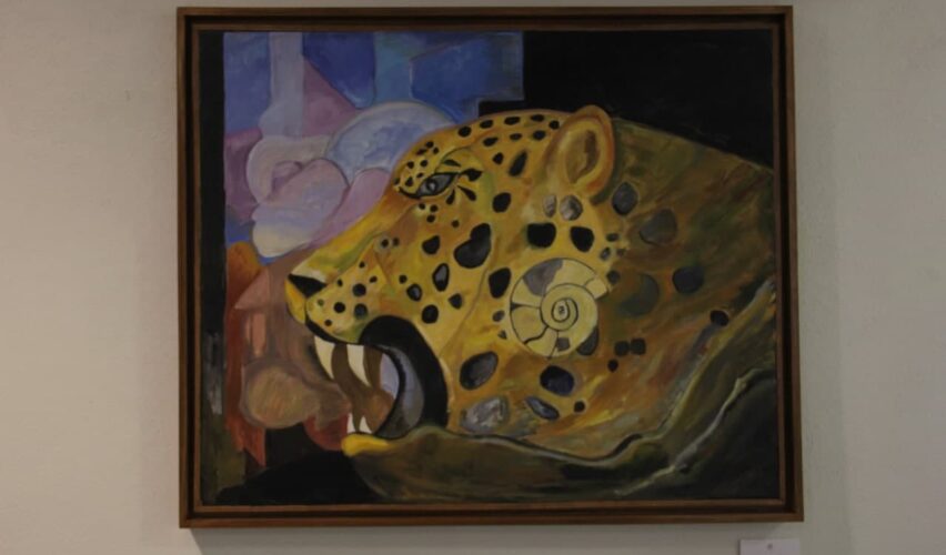 Querétaro, Qro., 12 de enero de 2022.- La escultora mexicana Gogy Farías homenajea mediante la pintura y la escultura a una grandiosa civilización prehispánica en la exposición Herencia Maya. Farías plasmó una interpretación abstracta, onírica y cubista en la obras que conforman esta muestra dedicada a la cosmovisión de dicha cultura del sureste mexicano.