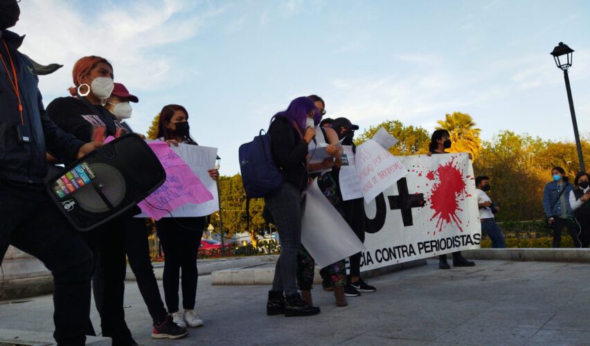 Congregados en el monumento a Ignacio Pérez, sobre avenida Universidad, los periodistas mostraron lonas y cartulinas con frases como “No más violencia”, a unos días de la muerte de Lourdes Maldonado López, la tercera periodista asesinada en este 2022.