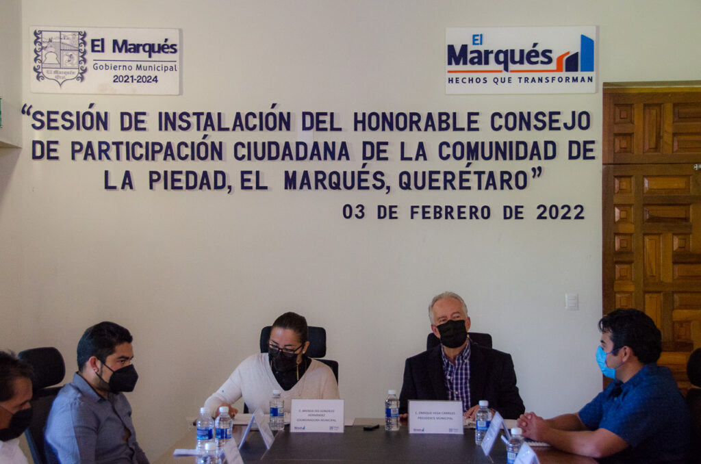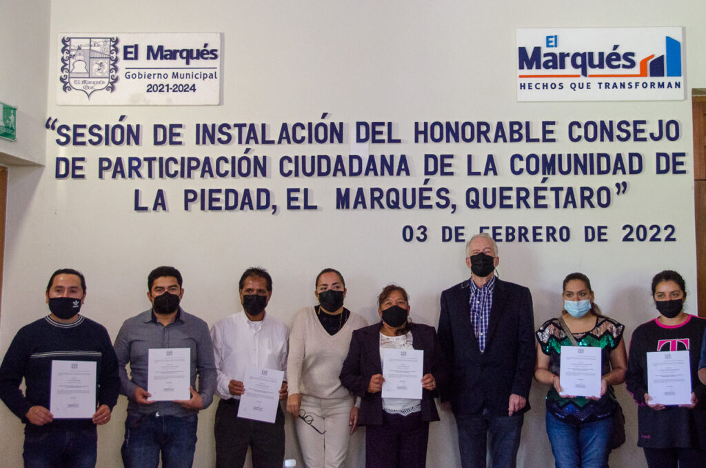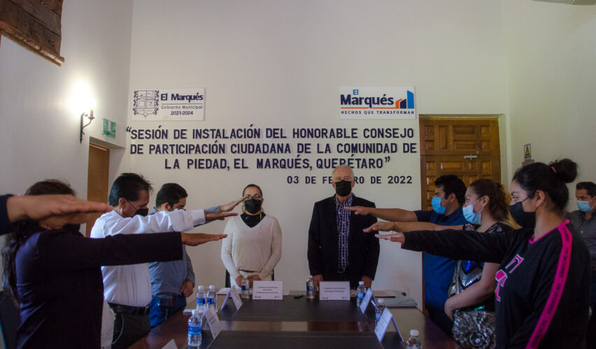 El Marqués, Qro., 3 de febrero de 2022.- El presidente municipal de El Marqués, Enrique Vega Carriles, tomó protesta a los consejeros propietarios del Consejo Municipal de Participación Ciudadana de la comunidad de La Piedad.