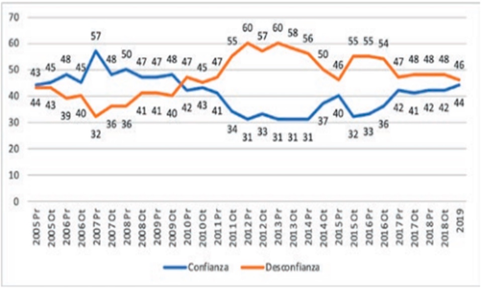 Imagen 1: Evolución de la confianza en la UE 2005-2019 (Rodríguez, 2020, p.97)