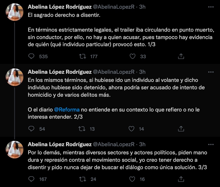 Según Abelina López Rodríguez, licenciada en derecho, no hay a quién acusar de atentar contra la integridad física de los elementos de seguridad, pues el camión iba en punto muerto y no había un conductor a bordo.