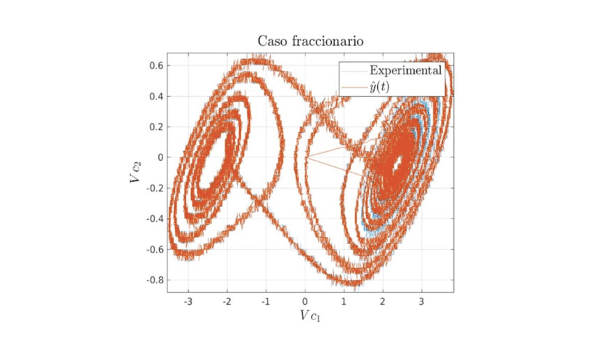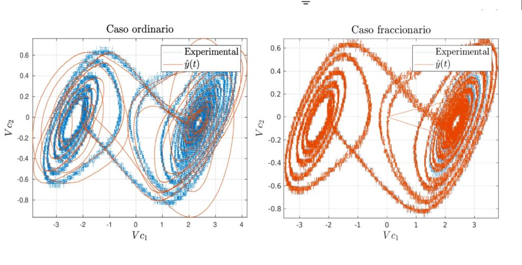 Para mostrar el potencial del CF, en la Figura 3 mostramos una comparativa entre un modelo matemático clásico y uno de orden fraccionario para modelar los voltajes de dos capacitores que se encuentran en un circuito equivalente de Chua, circuito electrónico ampliamente utilizado para estudiar caos.