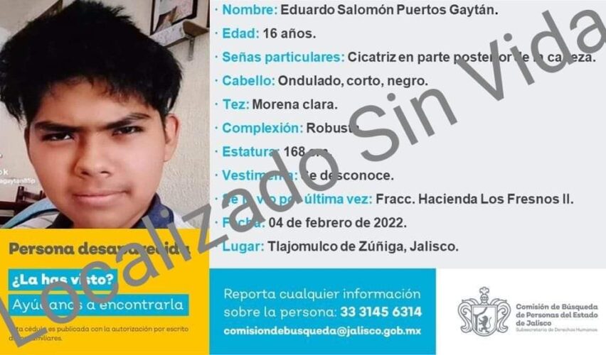 Tlajomulco de Zúñiga, Jal., 8 de febrero de 2022.- El pasado 4 de febrero, Eduardo Salomón Puertos Gaytan, de 16 años y originario de Tlajomulco de Zúñiga, fue reportado como desaparecido; de acuerdo con sus familiares, se lo llevaron a las 14:30 horas de su propia casa hombres encapuchados y armados. Este domingo 6 de febrero su cuerpo fue localizado al interior de una finca.