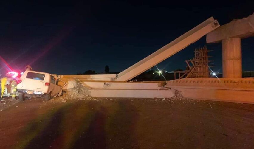 Tecámac, Estado de México, 11 de febrero de 2022.- La madrugada de este viernes cayó una estructura perteneciente a un puente que conectará a la autopista México-Pachuca, para comunicar a la Ciudad de México con el nuevo Aeropuerto Internacional Felipe Ángeles. El enorme bloque de concreto golpeó una camioneta que transitaba por el sitio; afortunadamente el conductor sobrevivió.
