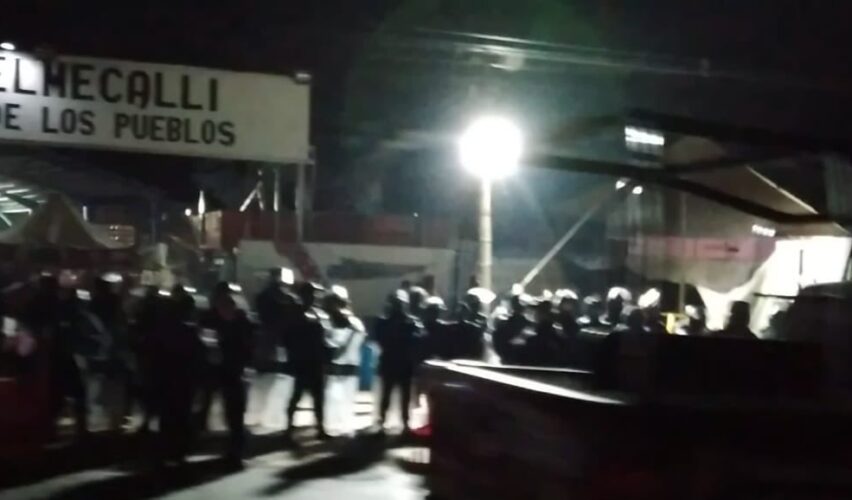 Juan C. Bonilla, Puebla, 15 de febrero de 2022.- En la madrugada de este martes, más de 50 vehículos de la policía y la Guardia Nacional desalojaron con amenazas la Casa de los Pueblos Altepelmecalli, ubicada en carretera libre México-Puebla, en el municipio de Juan C. Bonilla. Hasta el 22 de marzo de 2021 el centro cultural eran instalaciones ocupadas por la empresa francesa Bonafont.