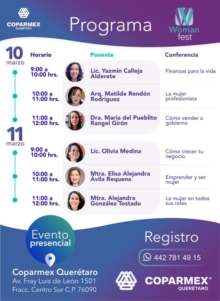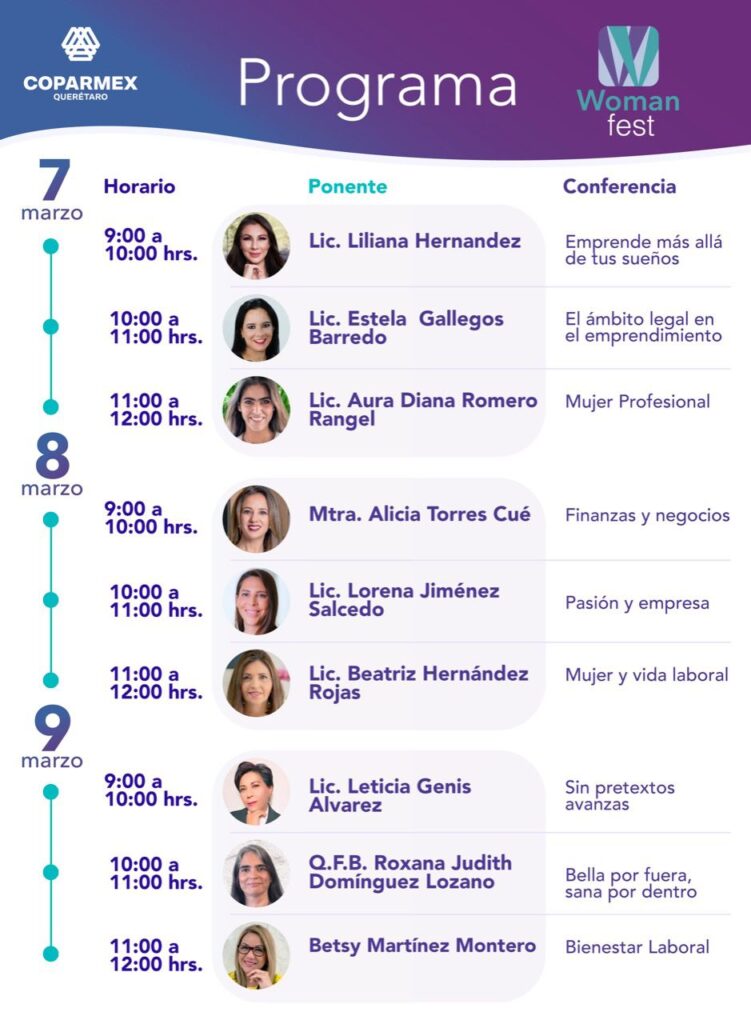 Los temas de las conferencias irán del ámbito personal al profesional, en materias como liderazgo, finanzas, emprendimiento, bienestar laboral, entre otros. Woman Fest es parte de una serie de eventos que realizará Coparmex Querétaro por el Día Mundial de la Mujer.
