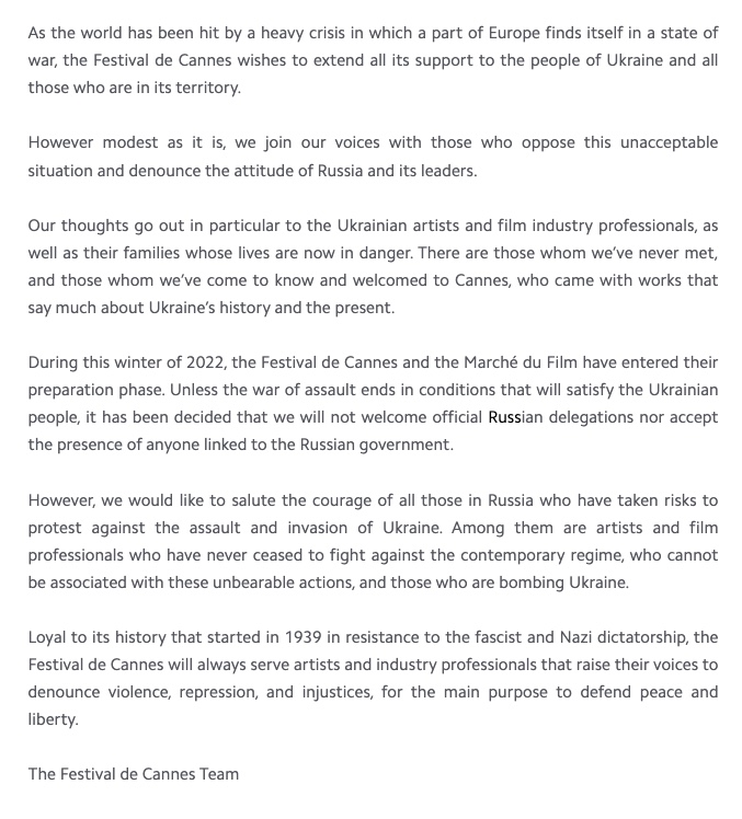 Comunicado del Festival de Cannes en el que se informa que no permitirán la participación de ninguna delegación rusa en el evento hasta el fin de la guerra con Ucrania.