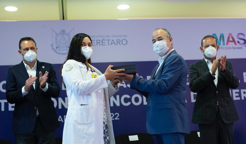 Querétaro, Qro., 23 de marzo de 2022.- El gobernador de Querétaro Mauricio Kuri presenció la entrega de equipo médico por parte de la Embajada de Israel en México al Hospital Infantil Teletón de Oncología (HITO). Este material, en palabras del embajador Zvi Tal, permitirá mejorar y fortalecer los servicios de salud que se brindan en el hospital, en beneficio de niñas y niños con cáncer.