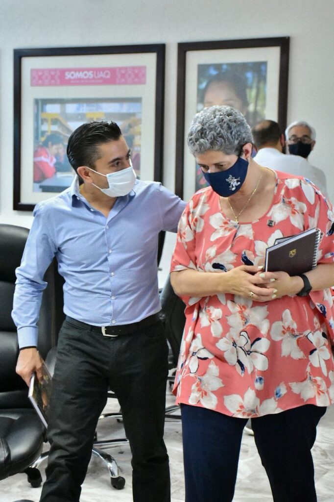 Corregidora, Qro., 30 de marzo de 2022.- El alcalde de Corregidora, Roberto Sosa Pichardo, y la rectora de la UAQ, Teresa García Gasca, se reunieron para tratar proyectos en los que trabajan el municipio y la universidad de manera coordinada, como la limpieza de la presa de El Batán y la construcción de una nueva preparatoria en la comunidad de Charco Blanco.