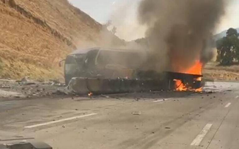El accidente se registró en la autopista México-Puebla, a la altura del paraje Llano Grande, cuando el tráiler cruzó el muro del contención e invadió el carril contrario, provocando un brutal choque contra un autobús de pasajeros, el cual se incendió a consecuencia del impacto.
