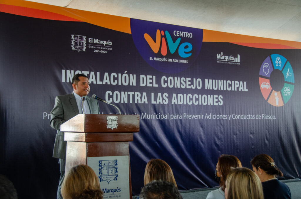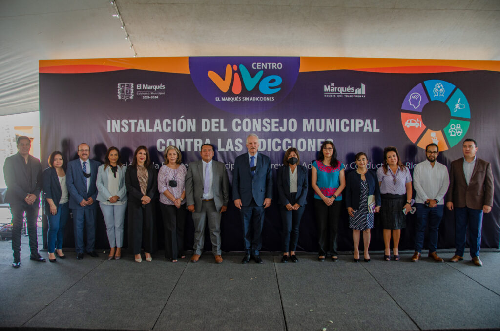 El Marqués, Qro., 9 de mayo de 2022.- El presidente municipal de El Marqués, Enrique Vega Carriles, presentó la primera estrategia integral a nivel municipal para combatir las adicciones y las conductas de riesgo, que otorgará atención a toda la población a través del Instituto Municipal para Prevenir Adicciones y Conductas de Riesgo (Centro Vive). Esto fue en el marco de la sesión solemne del Consejo Municipal contra las Adicciones, donde sus integrantes rindieron protesta.