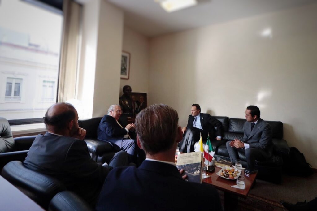 Roma, Italia, 2 de junio de 2022.- Derivado de la agenda de trabajo que emprende el gobernador de Querétaro, Mauricio Kuri González, en Roma, Italia, el mandatario sostuvo un encuentro diplomático con el embajador de México en el Vaticano, Alberto Barranco Chavarría, a fin de estrechar lazos que unen a la entidad y a la Santa Sede.